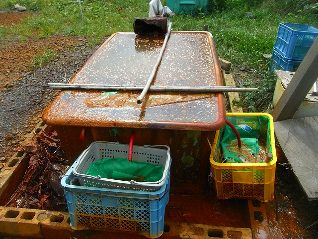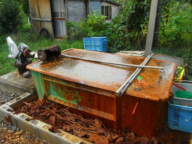 この源泉槽の端には何本かの新しめのホースが繋がっていて、ちょろちょろと源泉が出ています。