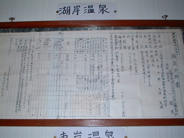 掲示されている手書きの分析書(昭和50年)には「含フッ素・含食塩-硫黄泉」と書かれています。