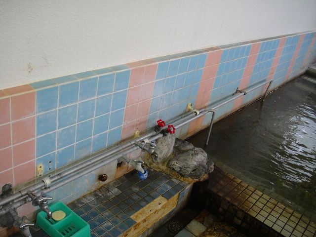 同時に水のパイプも湯船に伸びており、お湯は常に加水状態。