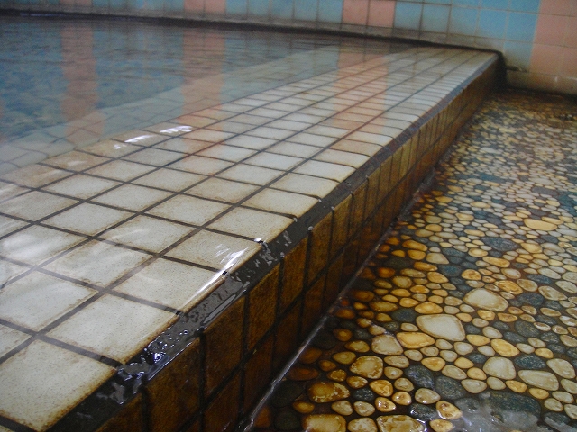 内湯は水色とピンクのタイルのコントラストが独特です(笑)