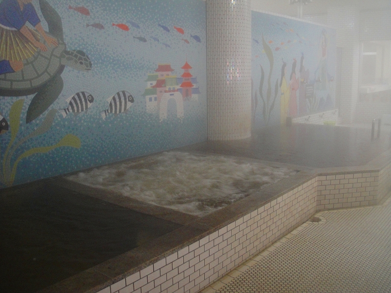 脱衣所から入ると右の壁沿いに湯船が並んでいます。壁に一面浦島太郎のタイル画が描かれているのが面白いですね。