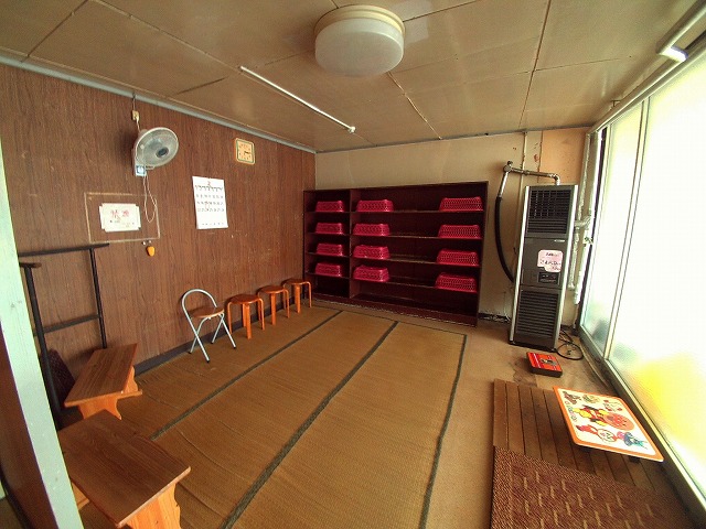 脱衣場は木の棚にプラスチックの脱衣かご。