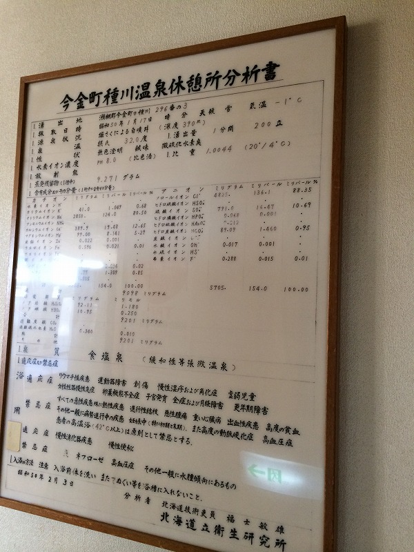 券売機に気付かず、受付で元気なご婦人に湯銭を払い中へ進むと、すぐ先に以前の分析書が掲示されています。
