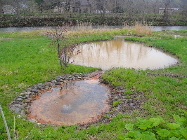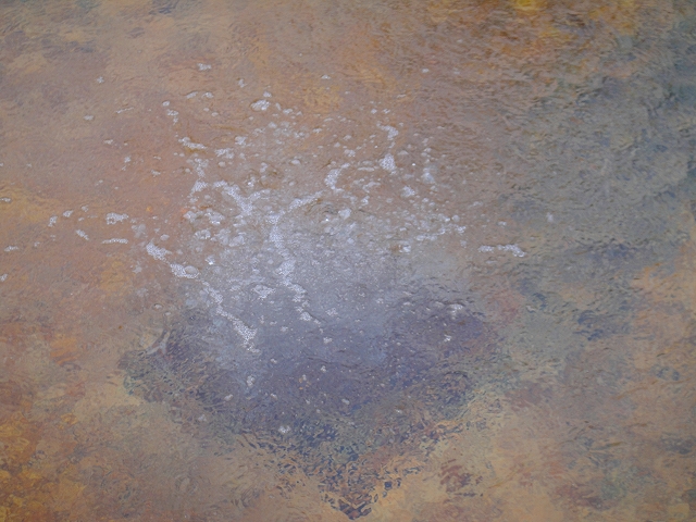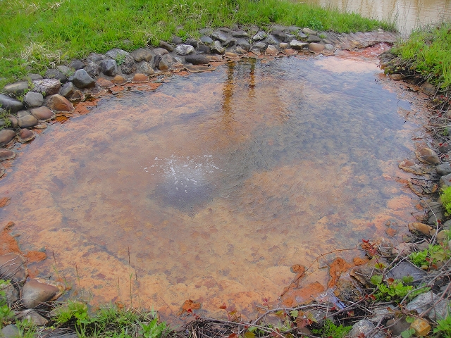 この湯だまりは透明で、中は赤褐色の湯の花でいっぱい。