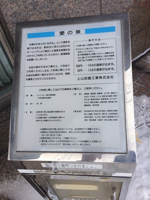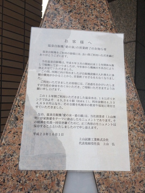 この札幌市内で貴重な温泉スタンドは、残念ながら2011年に機械の不具合により販売を停止し、そのまま廃止となりました。現在はモニュメントとして社屋の横にそのまま残されています。