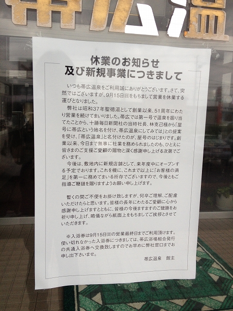 前日に温泉仲間からその話を聞きましたが、ちょうどその時に帯広にいましたので、玄関先で閉館の旨を記したこの掲示を見る事ができました。