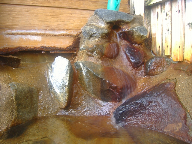 露天風呂の湯口です。壁の隙間からも出ているのはご愛嬌。