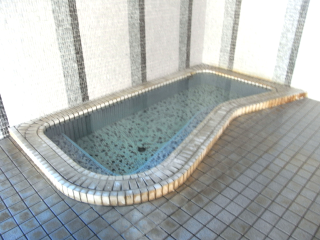 露天風呂のお湯もやはり無色透明ですが、口に含むと内湯では感じられなかった弱い金気臭、そして湯の花のようなものが見られました。