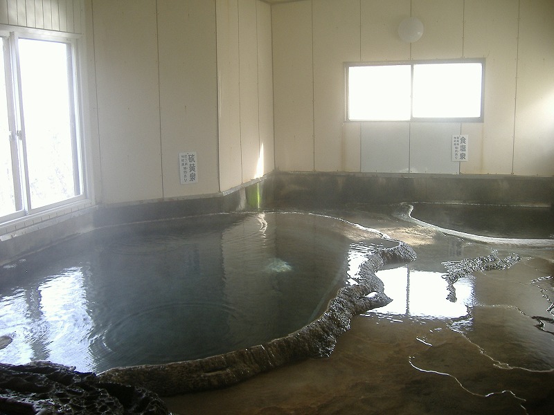 左側にあるのは硫黄泉。最も大きく深いこの湯船、青白いお湯です。
