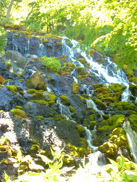 駐車場に車を停めて林の中を20-30分ほど歩くと、東屋のような建物や湯の滝がありました。