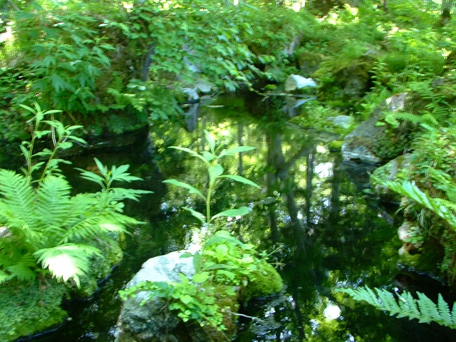 こちらが、緑に囲まれた滝の上の湧出部分の湯だまりです。