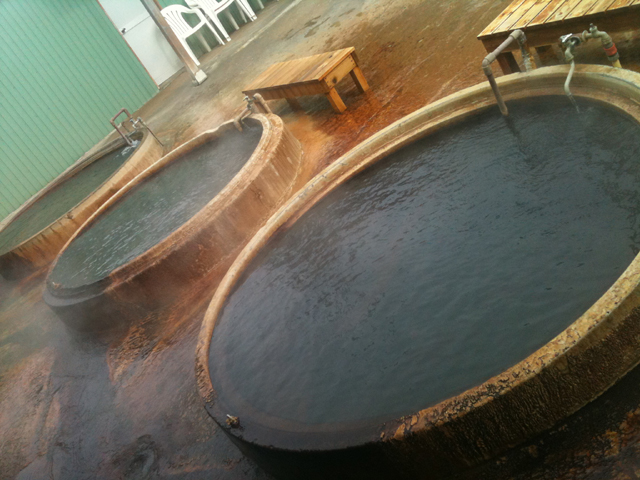 内湯は加水の量によって温度が異なり、手前から41℃・43℃・46℃ほど。地元の方によれば、一番奥の湯船はこの日はちょっと温いとのことでした。湯船に手を入れた時の感覚で温度も分かってしまう地元の方にさすがと思いつつ、3つの湯船のお湯を楽しみました。