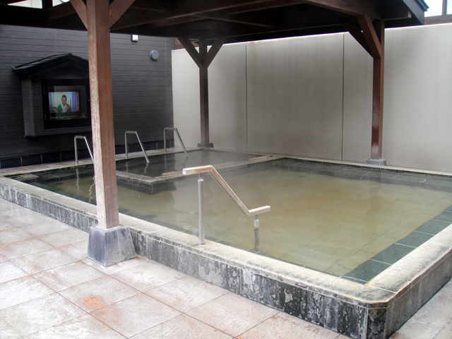 東屋風の屋根とTV付き・浴槽内に寝湯スペースもある15人ほどは入れそうな温めの大きな浴槽が一つ。
