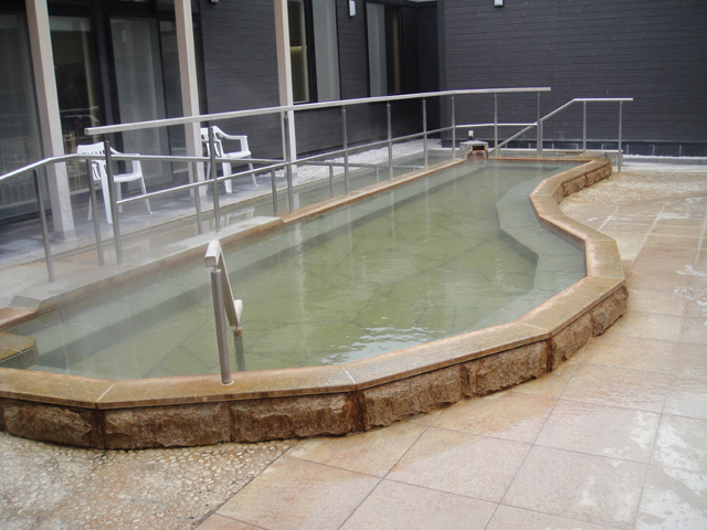 そして、すぐ横に歩行湯も備える、10人ほど入れそうな瓢箪半分型の湯船が1つありました。こちらは43℃ほどです。