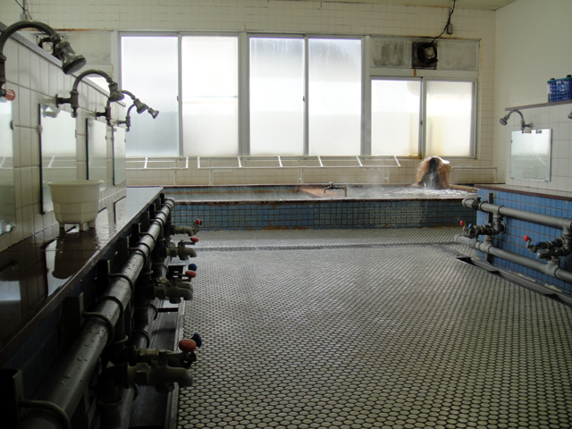 赤と青のカランとシャワーが並ぶ洗い場と、その先に見える湯船。まさに昭和な銭湯の雰囲気そのままで、非常に落ち着きます。