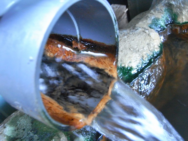 こちらが湯口です。湯口と湯尻の色がとてもきれいで、見ているだけで楽しくなってきます。お湯はひたすら出ては溢れていきます。