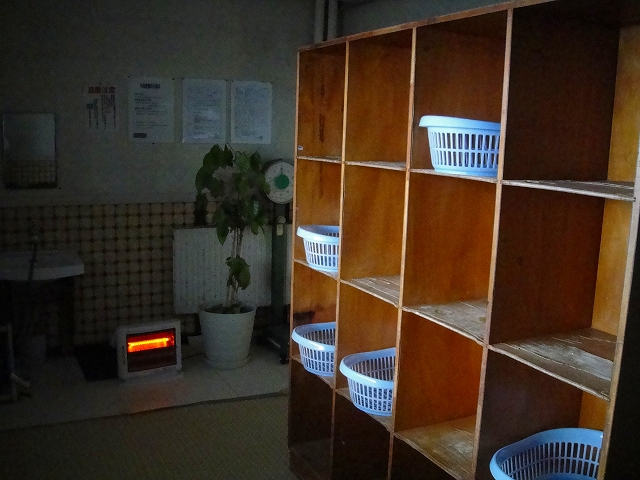 脱衣場に入ると目の前に壁があり、回り込むと脱衣かごの入った棚になっていました。棚を見て、私ひとりの貸切状態であることを確信(笑)