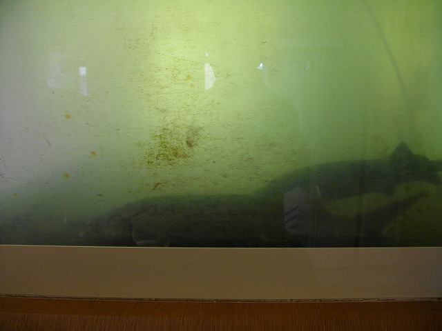 ロビーにあるチョウザメの水槽も、以前来たときと同じく、コケで中が全然見えません・・