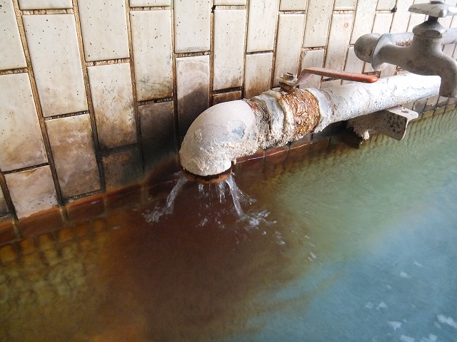 周囲の色が変わり、パイプにも成分が付着していますが、お湯は無色透明。湯口での温度は約52℃でした。