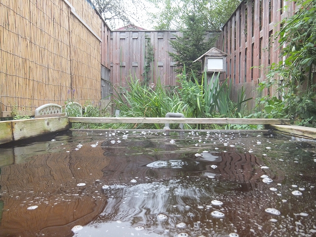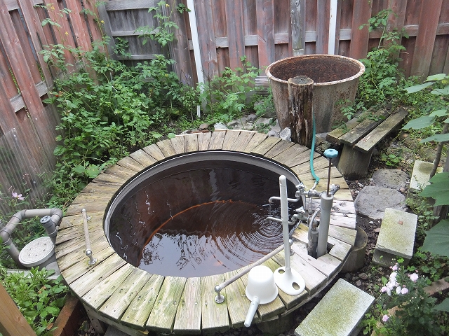 露天風呂は温泉ガイドなどでもおなじみの丸いミルクタンクの湯船です。夏場は奥の小さな湯船にもお湯を入れているそうです。