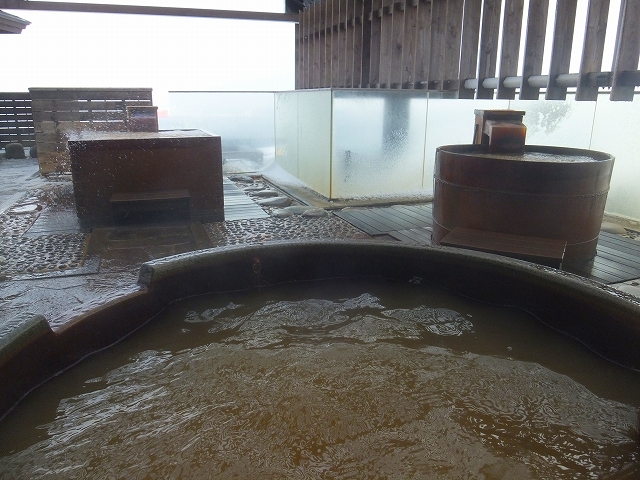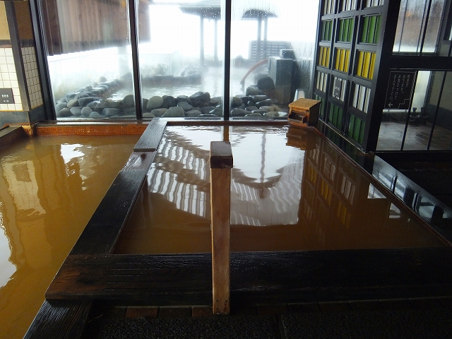 こちらが夜の内湯。湯船の底が全く見えない茶色いお湯で、非常に入るのが楽しみになりました。