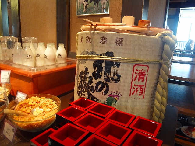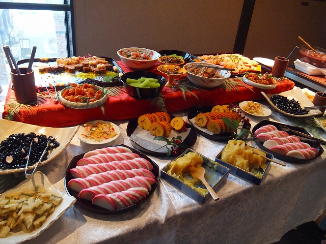 元旦の朝ということで、おせち料理も盛大に用意されており、汁物のコーナーにはお雑煮、ドリンクコーナーではお神酒も用意されていました。