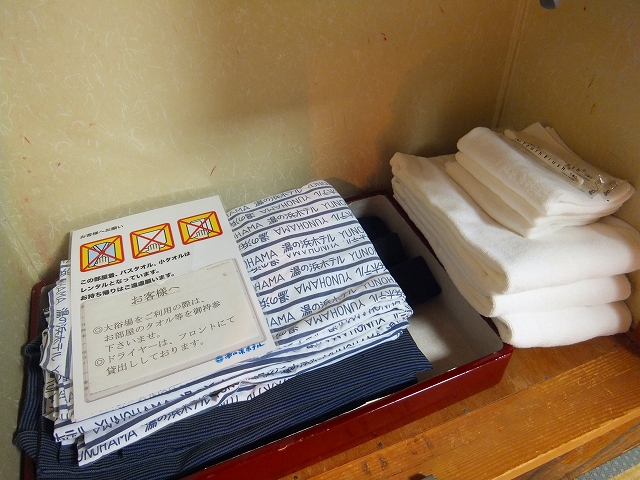 クローゼットの中には浴衣とタオル、歯ブラシ。カミソリは浴室に、ドライヤーは脱衣場かフロントからレンタルとのことでした。