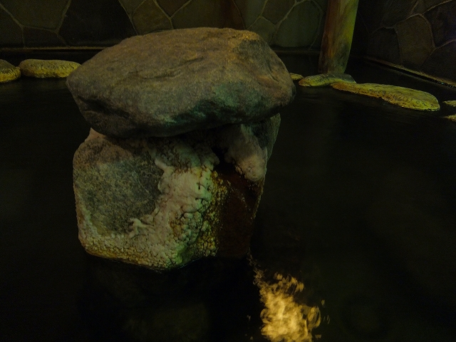岩風呂の中心にある湯口には、成分が堆積しています。