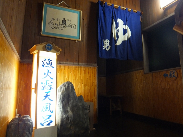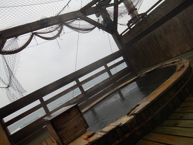 この湯船は壁に囲まれており、洗い場もありますが、天井は漁業に使う網。宿泊時の朝は雨が降っていて、長居しませんでした。