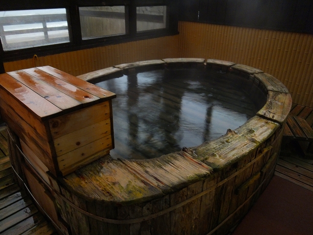 檜風呂。5-6人入れる大きさで、約42℃、かけ流し。
