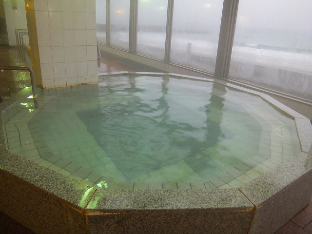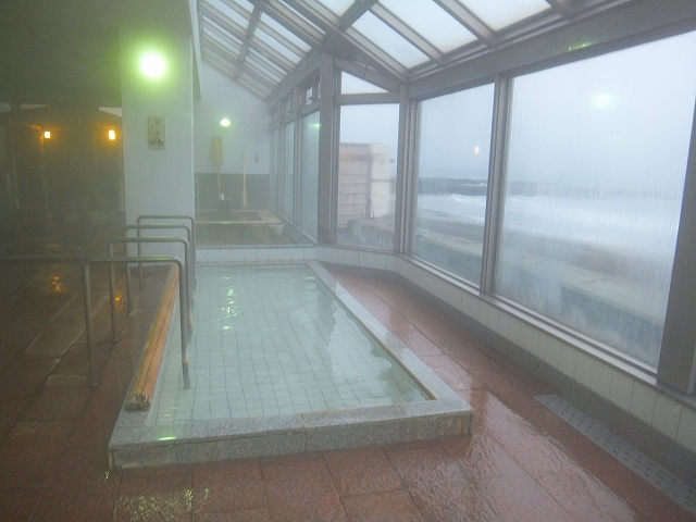 夜に入った時は天候も穏やかで、打ち寄せる波の音を聞きながらひとり静かに湯船に浸かることができました。立ち上がると海岸沿いに街明かりも見え、この夜の露天風呂が非常に好印象でした。