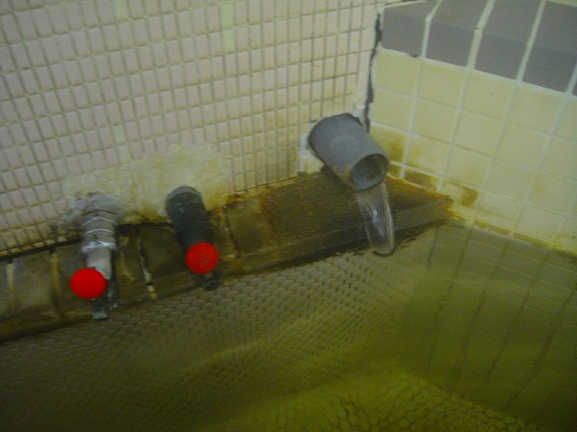 湯口の反対側の端に排湯口のパイプがあり、お湯はかけ流しで使用されています。湯船の中は約44℃。少し熱めでした。