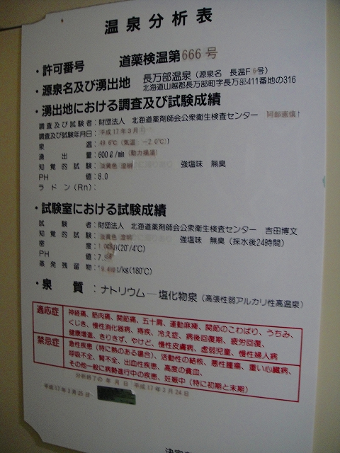 掲示されている平成17年3月の分析書によれば、こちらの温泉は源泉名「長万部温泉(長温R2号)」。