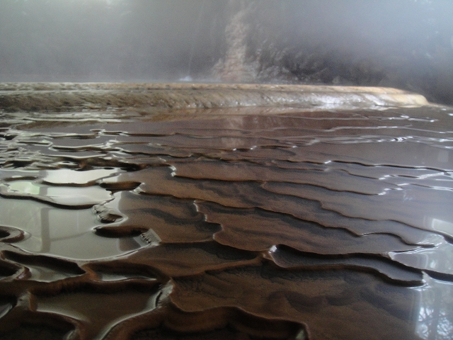 湯口付近にも白く成分が堆積していますが、このように浴室の床は一面、見事な千枚田状態になっています。湯船の中にも同じように成分が堆積しており、視覚的にも楽しめる湯殿でした。