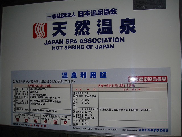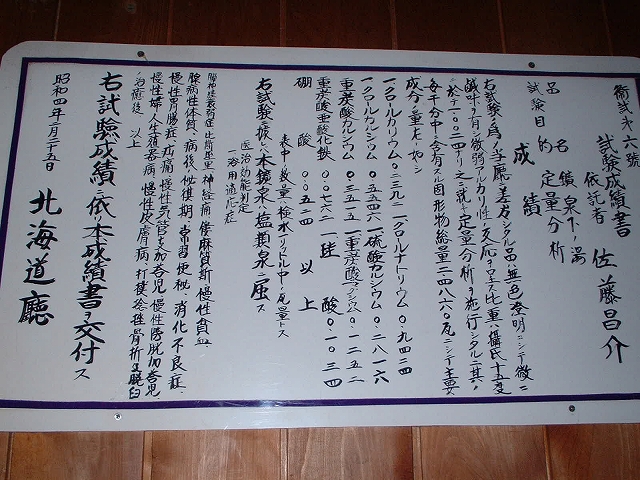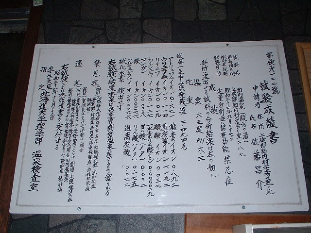掲示されている平成24年12月の分析書によれば、こちらの温泉は源泉名「知内温泉[湯ノ里2号井(丙)]」。