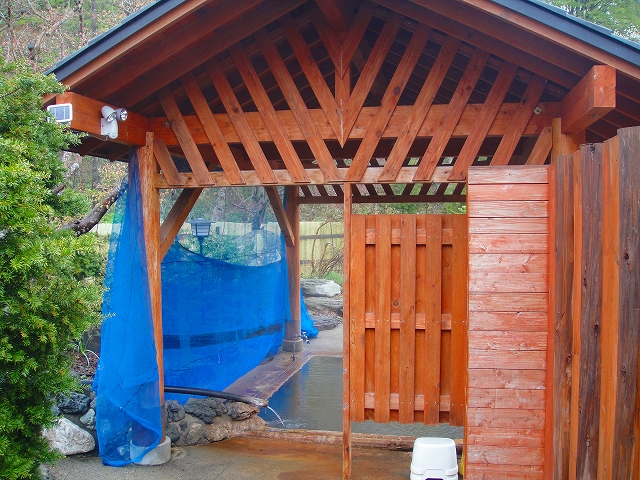 この写真の右側に写っているのが脱衣用の棚です。露天風呂はここ1つだけで実質混浴になりますし、脱衣スペースが開放的なため入りにくく感じる方もいるかもしれません。