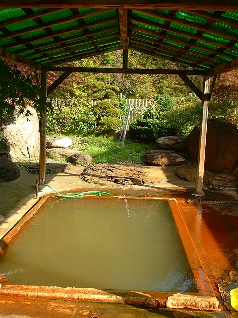 上の湯よりも少し強めに色づいた鶯色に近い湯色の透明湯で、湯船の中には褐色の湯花がたくさん舞っており、タオルにも色がつくほどです。こちらもまたツルキシ感を感じるお湯でした。