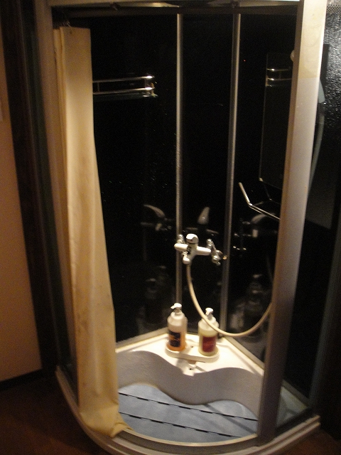 洗い場がない&強酸性のお湯ということで脱衣場内にシャワーブースが設置されていますが、ラメ入りで黒い壁のシャワーブースで、けっこうインパクトがありました^^;