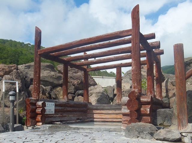 屋根がない丸太作りで、硫黄泉の湯船です。