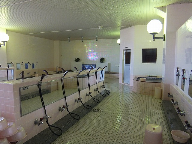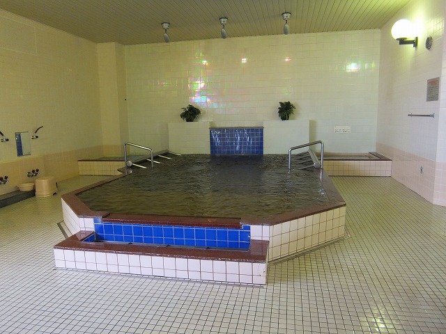 真ん中に15人以上は入れそうな大きな温泉浴槽があり、その両脇に1-2人用の小さな真湯の浴槽があります。向かって右奥が電気風呂、左奥が超音波ネオン風呂。
