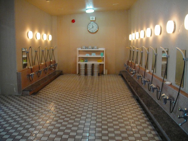 ちょうど入れ替わるように先客がいましたが、椅子も桶も何もありません。早い時間とはいえ洗い場がこれだけ整然としているのに少し驚きました。