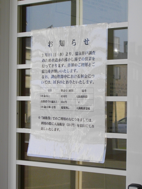 「2月11日より、温泉井戸調査のため水道水の沸かし湯での営業を行っております」