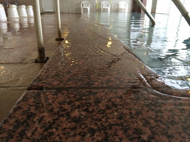 6-7人ほど入れる大きさの御影石の湯船で、温度は41.9℃。