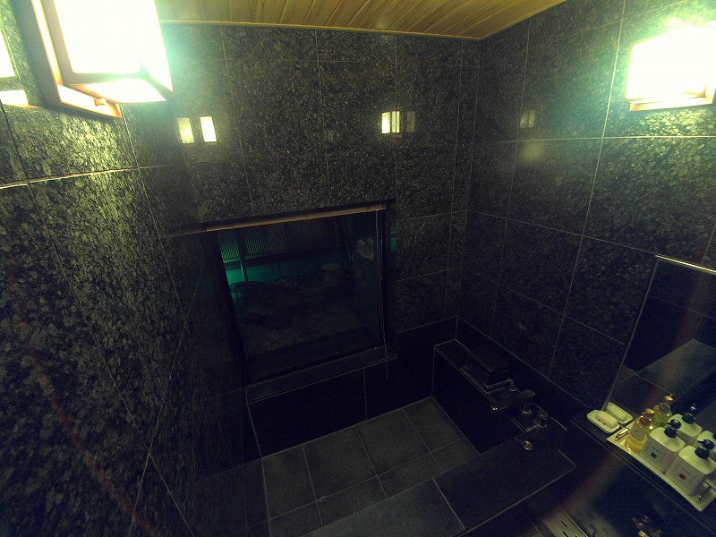 こちらが浴室です。大浴場の雰囲気に似ています。窓は開きませんが、窓から見える小さな庭のようなスペースが和の感じです。