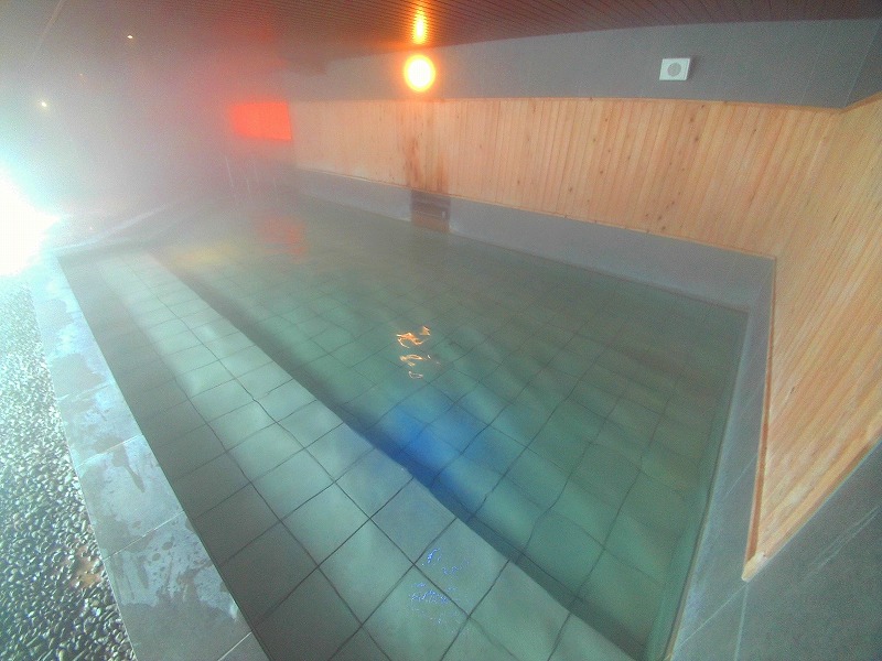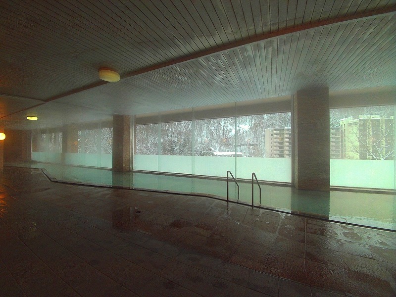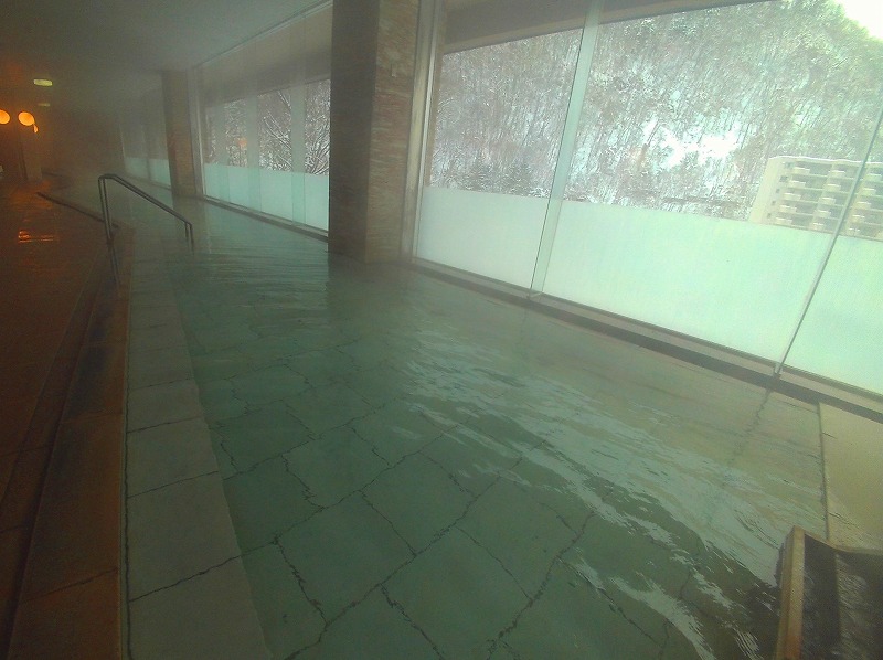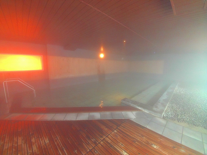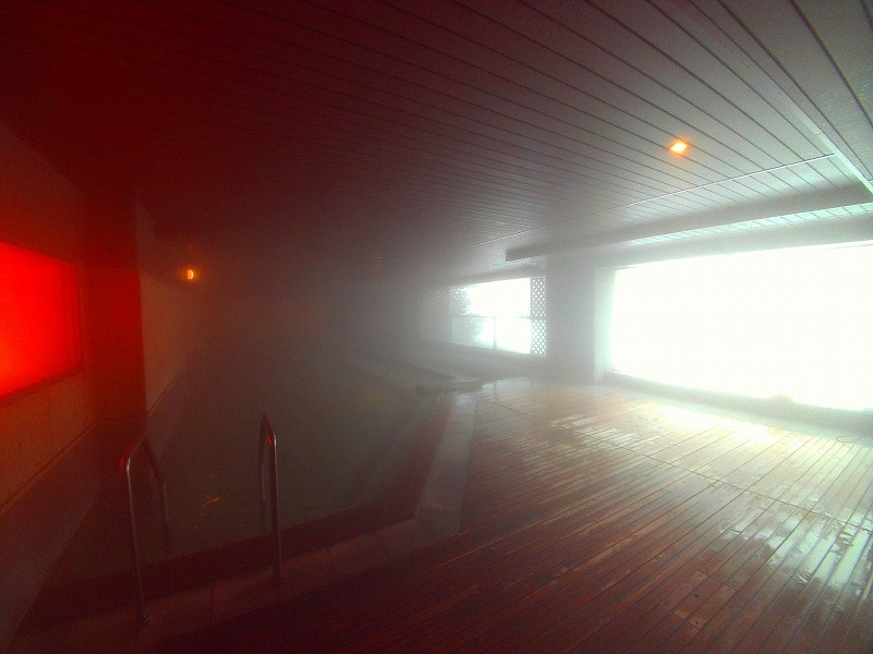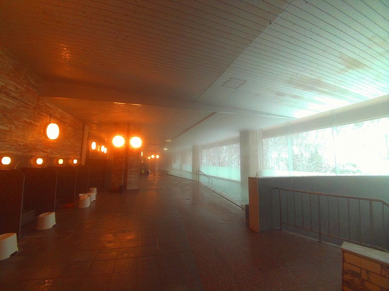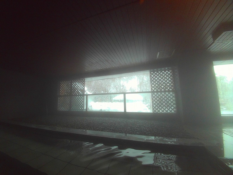 湯気があるため、向こうの端まで見えません・・30人40人入っても余裕がありそうな、実に巨大な湯船です。