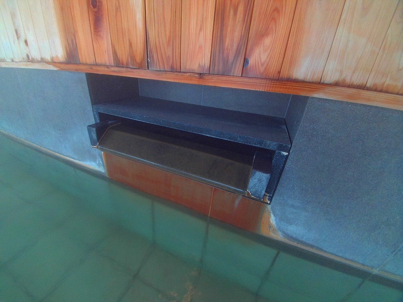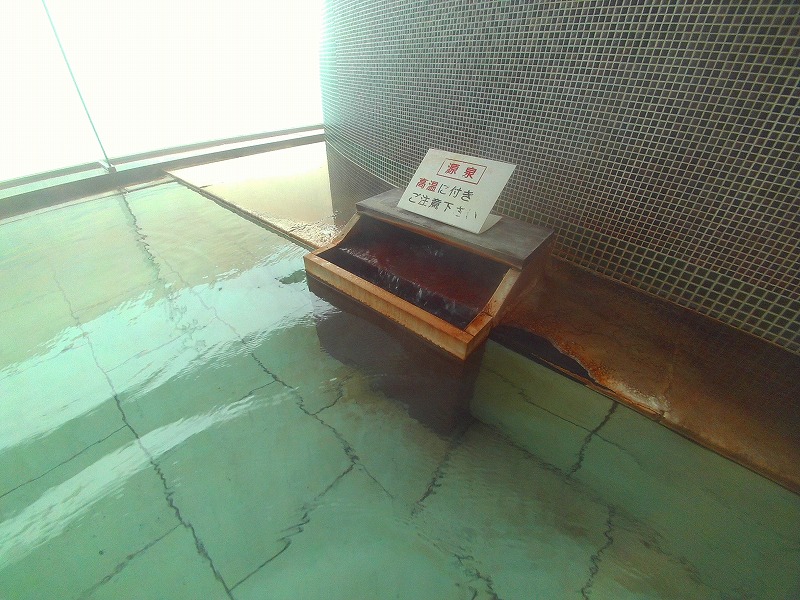 見える湯口はこれだけですが、よく見ると湯船に入る段差の下のあまり視界に入らない部分に何か所もパイプがあり、そこからもお湯が出ていました。それで多少の温度差はあるものの、この広い湯船のほとんどの場所でほぼ同じ温度となっています。