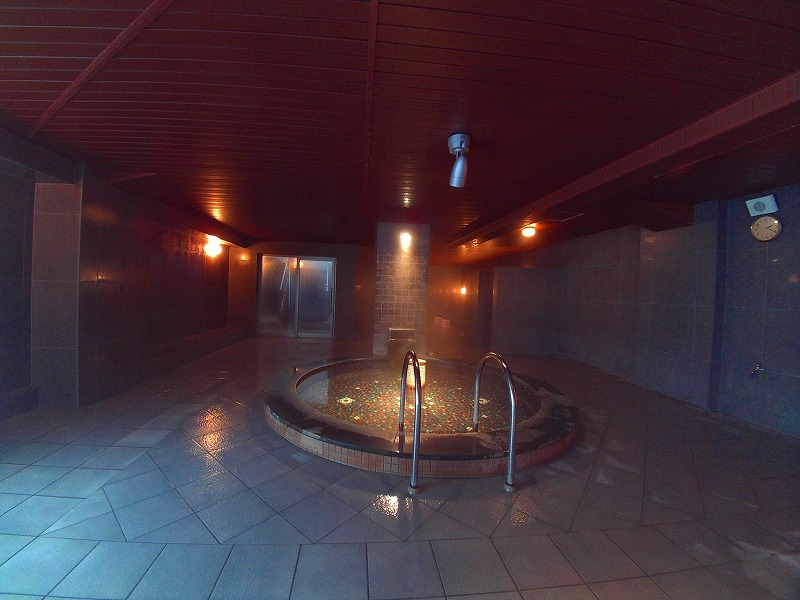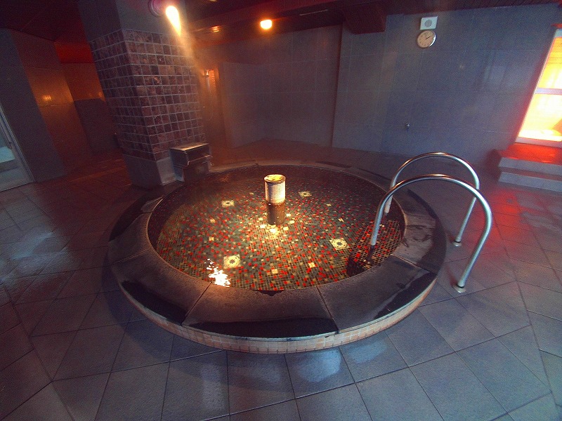 ここでまず目に入ったのは、スポットライトに照らされ、赤いタイルが印象的な美しい湯船でした。