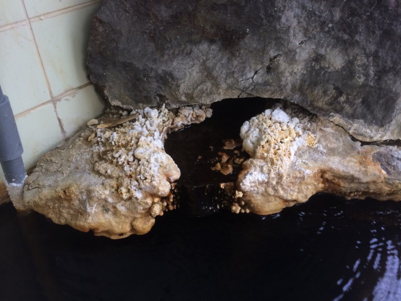 お湯は静かにオーバーフローしており、湯船の縁にはお湯の成分が堆積しています。