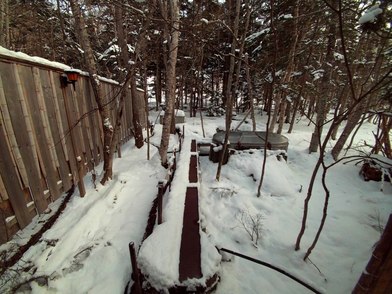 露天風呂へのドアを開けると、細い通路になっています。最初の1,2歩は足元に注意が必要でしたが、その先は融雪マットが敷かれていて冷たい思いをそれほどせずに歩くことができました。