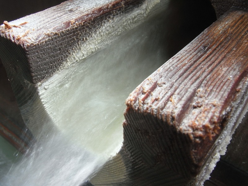 湯船の上に見える湯口から贅沢に注がれるお湯は、湯船の中と同じ41.3℃。その他に湯船の中にも湯口があり、42.5℃ほどのお湯が出ていました。